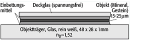 Die Dünnschliffe sind Gesteinsscheiben, die 25-30 um = 0,025-0,03 mm dünn geschliffen werden. In dieser Stärke sind sie transparent, so dass ihre optischen Eigenschaften im durchfallenden Licht untersucht werden können. Untersucht wird das Verhalten der Minerale, die ein Gestein aufbauen, gegenüber dem Licht das als Energiewelle durch ihr Kristallgitter läuft.