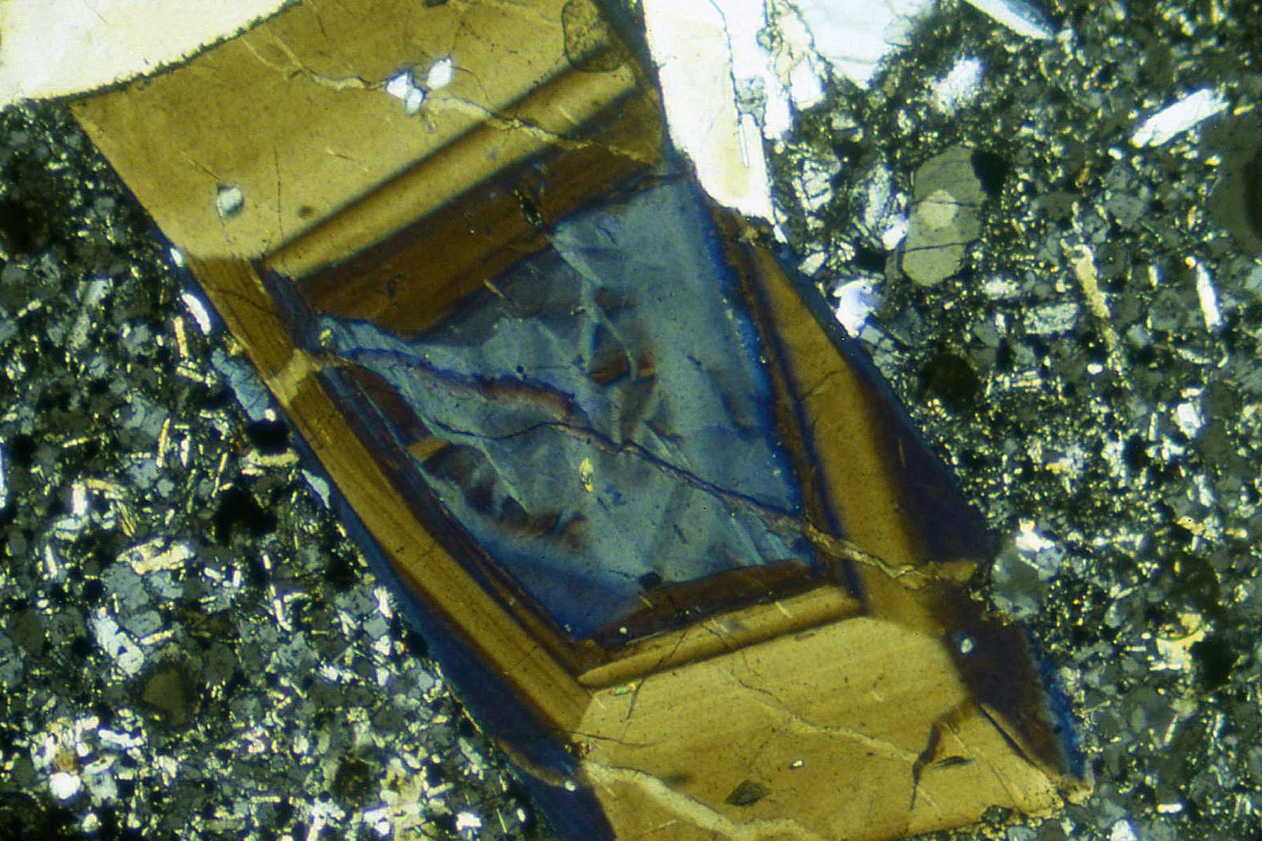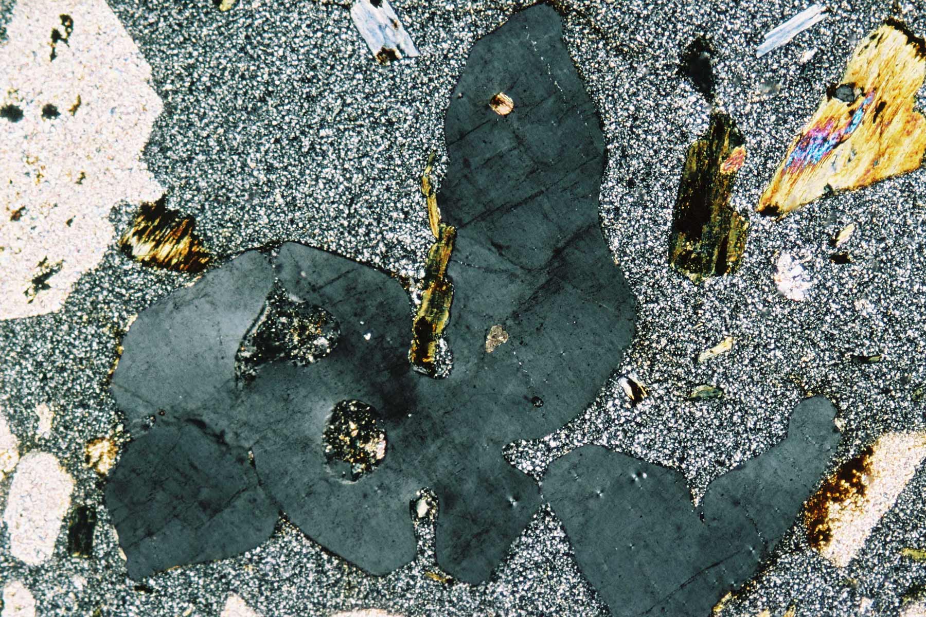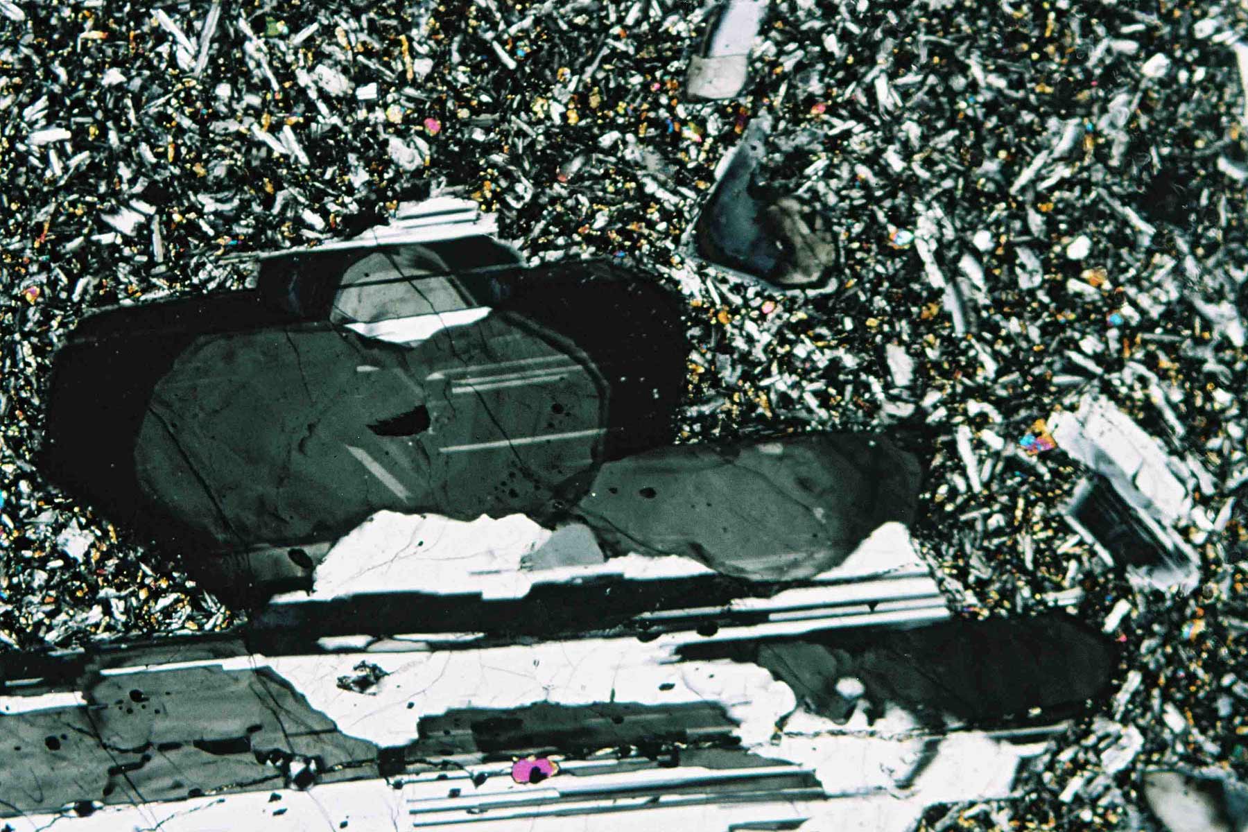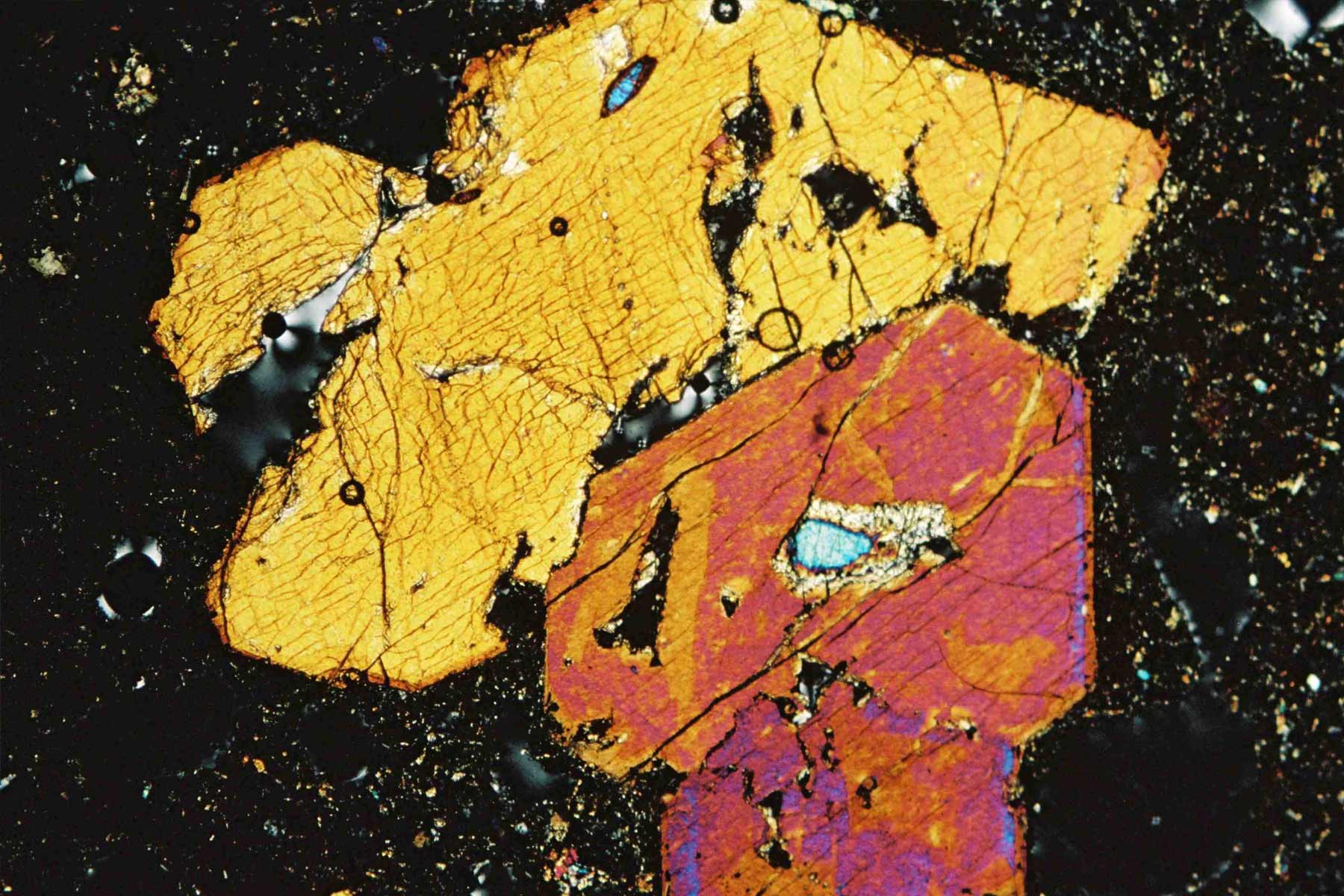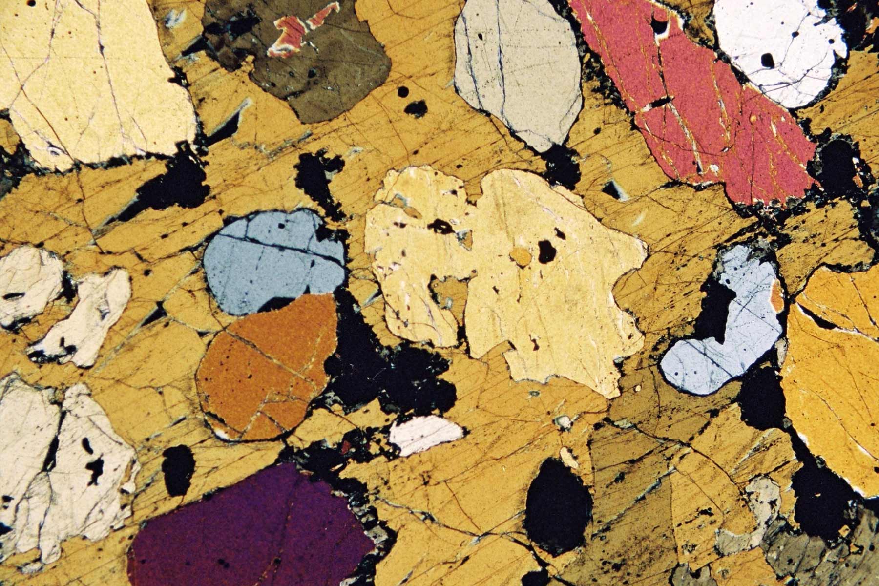 Alle Bilder wurden am Polarisationsmikroskop bei Durchlicht mit polarisiertem Licht (doppelt polarisiert) aufgenommen; es handelt sich um Ausschnitte von 2,5 - 3,6 mm bei 80 - 300facher Vergrößerung.